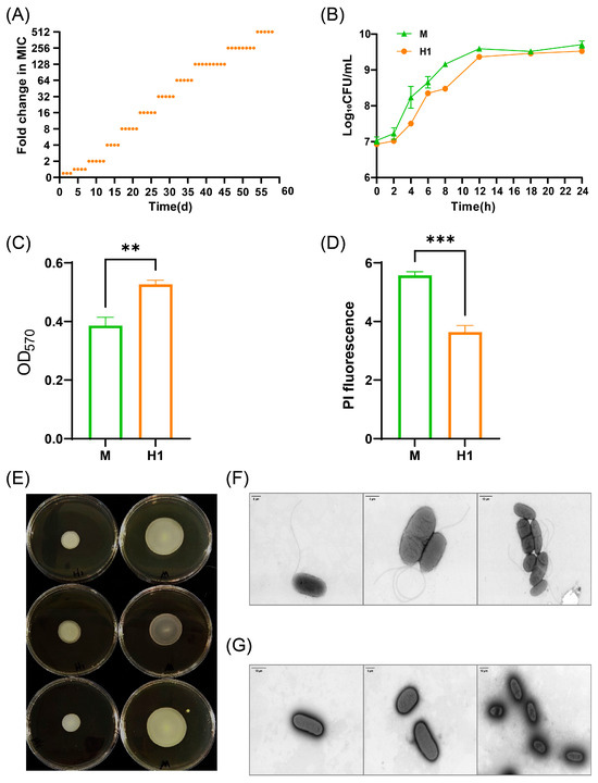 Phenotypic variation of strain H1. (A) MIC changes of strain H1 induced for 58 days. Each orange dot represents the fold change in MIC of the strain at different induction times. (B) Growth curves of strains M and H1. (C) Biofilm formation ability of strains M and H1. (D) Cell membrane permeability of strains M and H1. (E) Motility of strains M and H1: the left three dishes are strain H1, and the right three dishes are strain M. The colony formed by strain H1 on semi-solid agar was smaller than that formed by strain M, further indicating reduced motility. (F) Flagella of strain M observed by transmission electron microscopy. (G) Flagella of strain H1 observed by transmission electron microscopy. The flagellar morphology of strain H1 was altered, showing a sparse distribution compared to strain M. ** (p < 0.01), *** (p < 0.001).