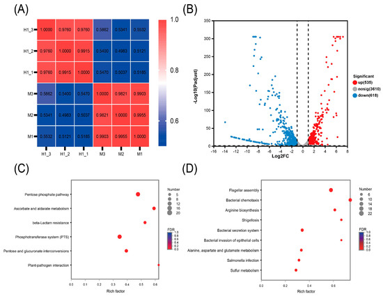 Transcriptomic changes of strain H1. (A) Heatmap illustrating the inter-sample correlation among strain H1 (n = 3) and strain M (n = 3). Correlation coefficients are represented between samples across the horizontal and vertical axes, with color gradients indicating the degree of correlation. (B) Volcano plot showing differentially expressed genes. Genes with an adjusted p-value < 0.05 and a fold change (FC) > 2 or <0.5 are defined as significantly differentially expressed. (C,D) KEGG-enriched metabolic pathways of the significantly upregulated (C) and downregulated genes (D) with enrichment rate on the horizontal axis and pathway names on the vertical axis. Circle size reflects the number of genes within each enriched pathway.