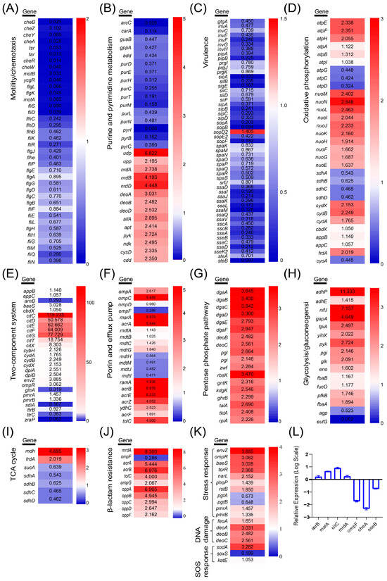 Differentially expressed genes in metabolic pathways. (A) Motility and chemotaxis. (B) Purine and pyrimidine metabolism. (C) Virulence. (D) Oxidative phosphorylation. (E) Two-component system. (F) Porin and efflux pump. (G) Pentose phosphate pathway. (H) Glycolysis/glycolysis. (I) Tricarboxylic acid cycle. (J) β-lactam resistance. (K) Stress response. For each gene in above pathway groups, the fold-change value was displayed within each box. Color intensity reflects the degree of up- or downregulation. (L) Relative transcriptional levels of seven genes in H1 determined by qRT-PCR.