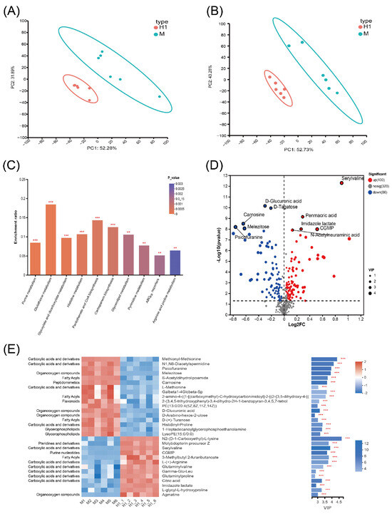 Metabolomic profiling changes of H1 and M. (A,B) PCA distribution plots in cationic (A) and anionic modes (B). (C) Top 10 differential metabolite enrichment KEGG pathways. The enrichment rate is proportional to the number of metabolites annotated to the pathway. The p-value size is shown by a color gradient. (D) Differential metabolite distribution volcano plot. The horizontal coordinate is the logarithmic value of FC of the metabolite between the two groups, and the vertical coordinate is the logarithmic value of the p-value, and the size of the dots in the plots indicates the VIP value. (E) Differential metabolite clustering heatmap (left) and VIP bar graph (right). The VIP bar graph reflects the size of the VIP value by the length of the bar, and the color depth of the bar reflects the size of the metabolite p-value. The darker the color, the smaller the p-value. ** or *** represents a p-value < 0.01 or <0.001, respectively.