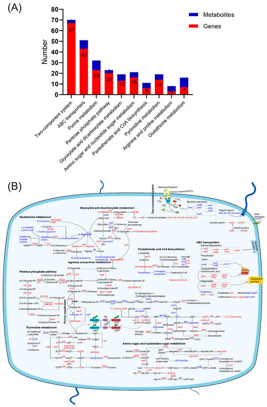 Joint analysis of differential genes and metabolites revealed compatibility between genotypic and phenotypic results. KEGG pathways co-enriched for both differential genes and metabolites included the two-component system, ABC transporter, purine metabolism, pentose phosphate pathway, glyoxylate and dicarboxylic acid metabolism, amino sugar and nucleotide sugar metabolism, pantothenic acid and coenzyme A biosynthesis, pyrimidine metabolism, arginine and proline biosynthesis metabolism, and glutathione metabolism (Figure 5A).
