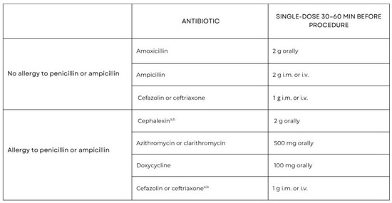 Prophylactic antibiotic regime for IE high-risk dental procedures and doses for adults [16,17]. a—Other first- or second-generation oral cephalosporin in equivalent dosing; b—Cephalosporins should not be used in an individual with a history of anaphylaxis, angioedema, or urticarial with penicillin or ampicillin. Adapted with permission from Ref. [16]. Copyright 2023, Oxford University Press.
