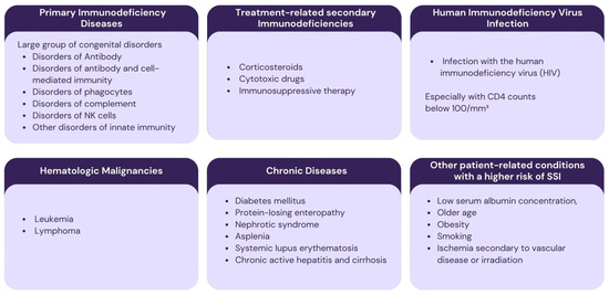 Each of the various functional compartments of the immune system contributes uniquely to host defense, and dysfunction in a specific compartment can markedly increase the risk of SSIs. Immunodeficiencies can be divided into primary and secondary immunodeficiencies. Primary immunodeficiencies involve congenital immune deficiencies. Secondary immunodeficiencies are those that are related to another illness or condition or occur as a result of treatment for such a condition [51,52].