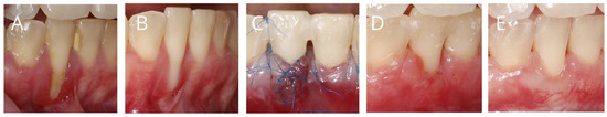 (A), Plaque-induced gingival inflammation as a contraindication for performing a surgical recession coverage procedure; (B), the clinical situation, following improvement in the patient’s plaque control and professional mechanical plaque-removal procedures; (C), recession coverage with laterally closed tunnel and SCTG; (D), 2 weeks post-surgery; (E), 6 months post-surgery.