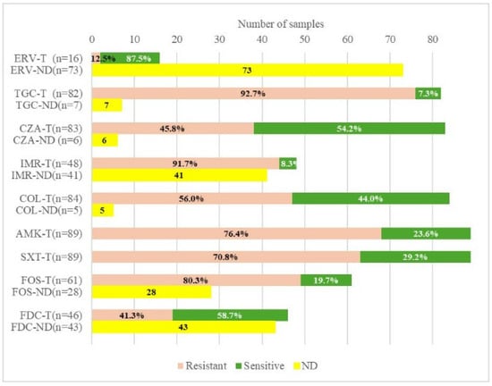 Antibiotic susceptibility for selected strains. ERV—eravacycline; TGC—tigecycline; CZA—ceftazidime/avibactam; IMR—imipenem/relebactam; COL—colistin; AMK—amikacin; SXT—trimethoprim-sulfamethoxazole; FOS—fosfomycin; FDC—cefiderocol; T—tested; ND—not determined.