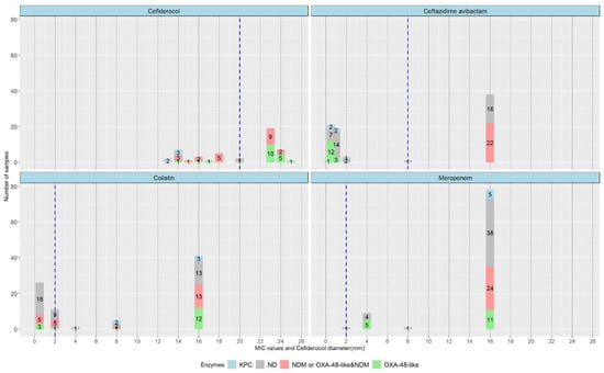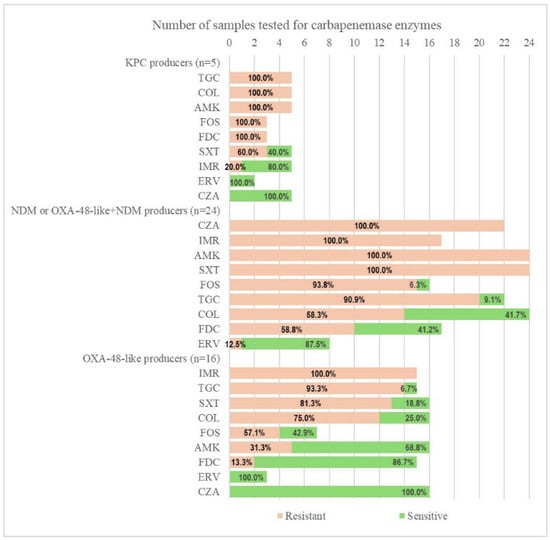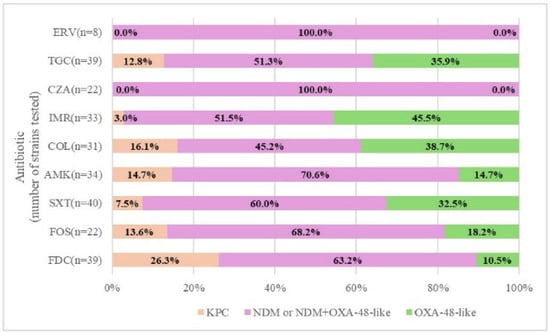 All 8 strains resistant to ERV and all 22 strains resistant to CZA were NDM producers or NDM–OXA-48-like co-producers. Except for their responses to ERV and CZA, the tested strains showed different mixed resistance profiles. Specifically, the samples resistant to FDC had 63.2% NDM or NDM–OXA-48-like, 26.3% KPC, and only 10.5% OXA-48-like enzymes, while among the COL-resistant strains, the tests showed 45.2% NDM or NDM plus OXA-48-like, 38.7% OXA-48-like, and 16.1% KPC carbapenemases (Figure 3).