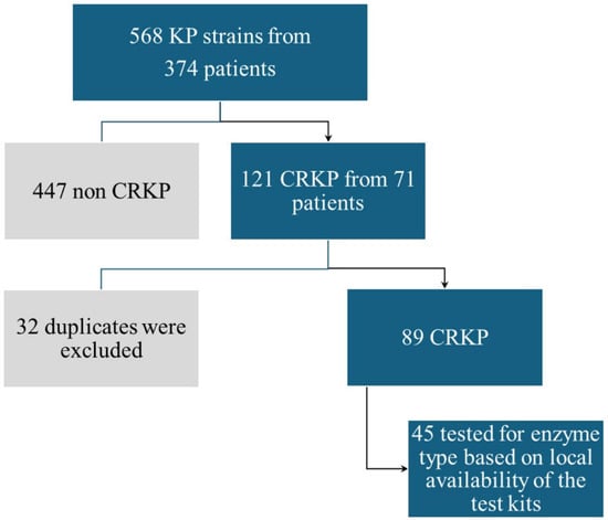 Our work was a cohort study that included prospectively and retrospectively collected data. We isolated 568 KP strains from 374 patients admitted to our hospital with various complaints between January 2023 and January 2024; 121 of these strains turned out to be CRKP (21.3%) and were taken from various anatomical sites of 71 patients associated with 77 hospital discharges. We selected 89 CRKP strains, eliminating double samples from the same site on the same person, and we further tested 45 of them for the presence of carbapenemase types (Figure 5).