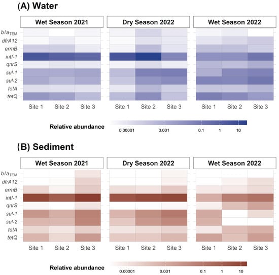 Relative abundance of ARGs in (A) water and (B) sediment samples from the Virilla River by qPCR during the three sampling campaigns. Values represent ARG copies normalized to 16S rRNA gene copies (i.e., copies per 16S rRNA gene). The color scale is logarithmic and ranges from 0.00001 to 10.