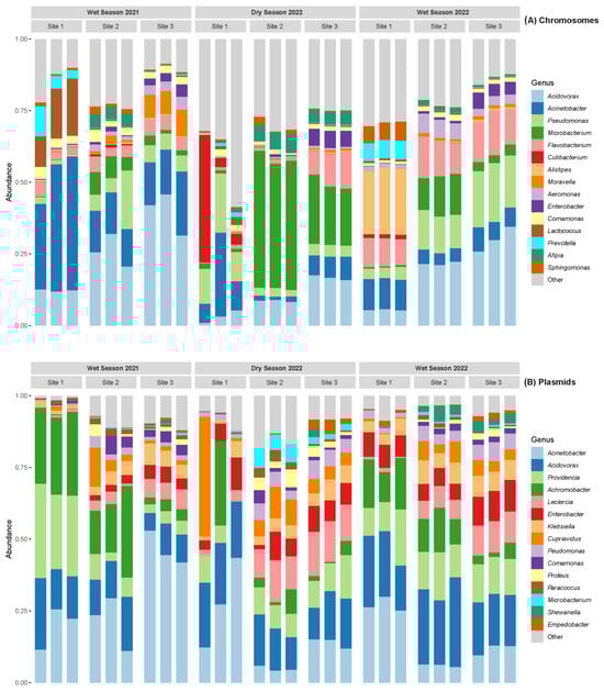 Relative abundance of the 20 most prevalent bacterial genera detected in chromosomal (A) and plasmid (B) fractions from sediment metagenomes collected during three sampling campaigns and sites along the Virilla River.