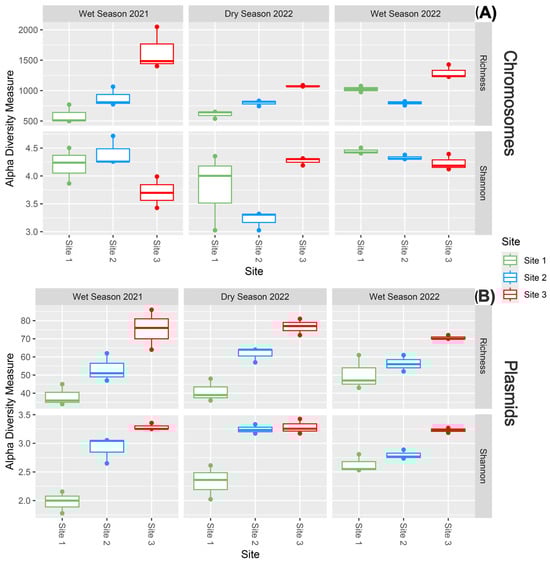 Alpha diversity plots show the number of taxa (richness) and the Shannon diversity index derived from (A) chromosomal and (B) plasmidic datasets of potential pathogenic genera of the sediment samples. Data is presented by sampling campaigns and sites.