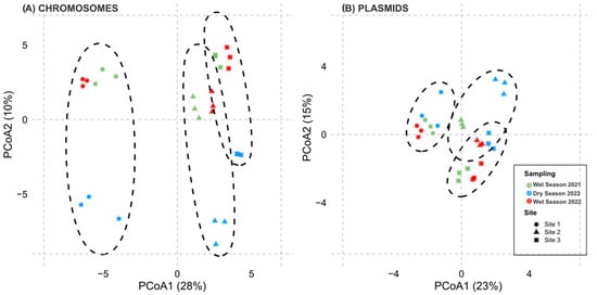 Principal coordinates analysis (PCoA) based on Bray–Curtis dissimilarity matrices computed from centered log-ratio (CLR) transformed taxonomic abundance profiles of potential pathogens in sediment samples. Panel (A) shows chromosomal profiles; Panel (B) shows plasmidic profiles. Colors indicate sampling campaigns (green = wet season 2021, blue = dry season 2022, red = wet season 2022), while shapes represent sampling sites. Ellipses denote sample variability within each site.