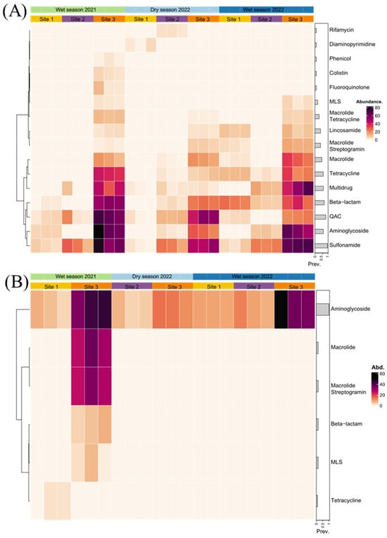 In contrast, plasmid-associated beta-lactam (H = 10.23, p = 0.0159), macrolide (H = 10.09, p = 0.0159), macrolide-streptogramin (H = 9.74, p = 0.0159), and MLS (H = 9.88, p = 0.0159) resistance were exclusively detected at Site 3 across all sampling campaigns and showed spatial variation. A significantly higher abundance of ARGs in plasmidic contigs was observed in the 2022 wet season compared to the 2021 wet season (H = 8.79, p.adj = 0.0251) and in the 2022 dry season compared to the 2021 wet season (H = 7.62, p.adj = 0.0483), with no significant differences between the 2022 dry and wet seasons.