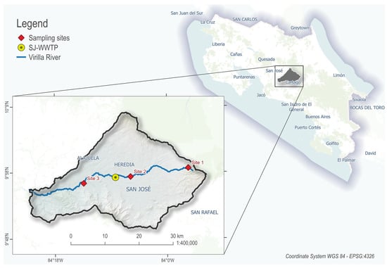 This study was conducted along the main course of the Virilla River watershed, located in the western Central Valley of Costa Rica (Figure 6). This watershed, part of the larger Grande de Tárcoles River Basin, has been heavily impacted by urbanization, with untreated sewage and industrial discharges contributing to high pollution levels [17,18].