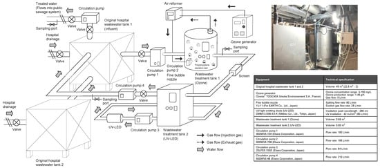 - Azuma, T.; Katagiri, M.; Sasaki, N.; Kuroda, M.; Watanabe, M. Performance of a pilot-scale continuous flow ozone-based hospital wastewater treatment system. Antibiotics 2023, 12, 932. [Google Scholar] [CrossRef]