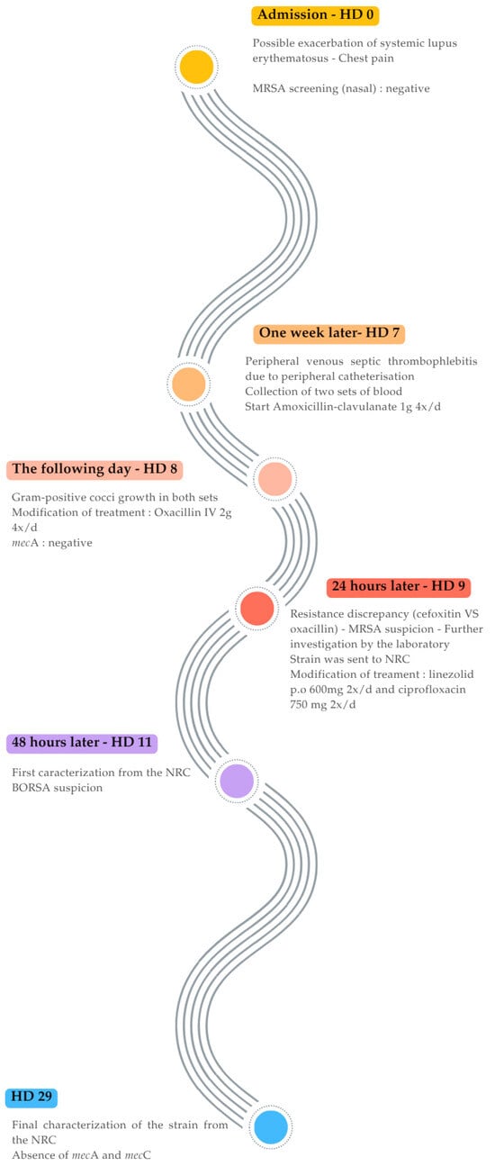 A 39-year-old woman was admitted for a suspected exacerbation of systemic lupus erythematosus, diagnosed one year earlier. The case was complicated by multiple serositis and nephritis. Her chronic treatment included methylprednisolone (32 mg daily) and hydroxychloroquine (200 mg twice daily). On examination, the patient was afebrile but complained of chest pain increased by breathing. Laboratory results showed 5690 leucocytes/µL, neutrophils 79%, C-reactive protein (CRP) 19 mg/dL (reference value < 5 mg/dL), estimated glomerular filtration rate (CKD-EPI) > 90 mL/min, normal hepatic enzymes, and increased D-Dimer levels at 4318 ng/mL (reference value < 500). A chest CT scan showed no pulmonary embolism, bilateral pleural effusion with passive atelectasis and hypoventilation. No blood culture were collected at admission. Nasal screening for MRSA carriage was negative. Bronchoalveolar lavage cultures were negative for common bacteria and Mycobacterium tuberculosis, and respiratory multiplex Polymerase Chain Reaction (PCR) panel (Taqman™ Array Card) did not detect atypical bacteria, viruses or fungi [9]. One week later, she developed peripheral venous septic thrombophlebitis following catheter placement. Intravenous amoxicillin–clavulanate 1 g, 4 four times daily was initiated. Two sets of blood cultures were collected on hospital day (HD) 7 and incubated using the BD Bactec™ FX system (BD diagnostics, Franklin Lakes, NJ, USA). After 17 h of incubation (HD 8), both sets grew Gram-positive cocci in clusters, later identified as S. aureus using the MALDI Biotyper® sirius IVD system (version 4.1.100, Bruker Daltonics, Bremen, Germany). The Clearview™ PBP2a SA Culture Colony Test (Abbott Diagnostics, Scarborough, ME, USA) was negative. Consequently, treatment was switched to intravenous oxacillin 2 g four times daily. However, antimicrobial susceptibility testing performed with the Vitek® 2 system, (Biomérieux, Marcy-L’étoile, France) using EUCAST guidelines 2023 (version 13.0) showed a discrepancy: the cefoxitin screen was negative while the oxacillin Vitek® 2-derived MIC value was ≥4 mg/L. Therefore, the expert system interpreted the strain as resistant to oxacillin. The isolate was also resistant to cotrimoxazole and tetracycline, susceptible to linezolid and susceptible (increased exposure) to ciprofloxacin. (Table 1) Due to difficult intravenous access, antibiotic therapy was transitioned on HD 9 to oral linezolid (600 mg twice daily) and ciprofloxacin (750 mg twice daily). Treatment was continued for 14 days from the first negative blood culture (Figure 1). Transthoracic cardiac echography was normal.