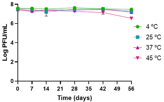 Phage PCSE1 was considerably stable under all tested temperatures, with phage titer remaining similar to the initial phage titer after 56 days (p > 0.05) at 4, 25, and 37 °C, without significant differences between them. A small decrease of 0.9 log PFU/mL was only observed at 45 °C (p < 0.05), after 56 days (Figure 2).