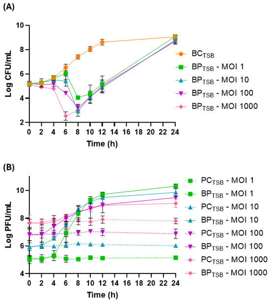 All phage controls (PCTSB) remained constant throughout the assay (Figure 3B). In the sample (BPTSB), a significant increase (p < 0.05) in phage titer was observed for all tested MOIs, with a higher increase observed for lower MOIs (5.2, 3.8, 2.6, and 1.3 PFU/mL increase for MOI 1, 10, 100, and 1000, respectively), relative to each corresponding PCTSB.
