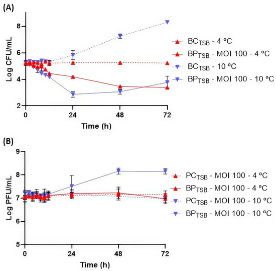 Regarding phage behavior, PCTSB remained stable at 10 and 4 °C. An increase in phage PCSE1 titer in BPTSB (1.2 log PFU/mL) was observed at 10 °C (p < 0.05), while at 4 °C, phage titer remained stable (p > 0.05) during the 72 h (Figure 4B).