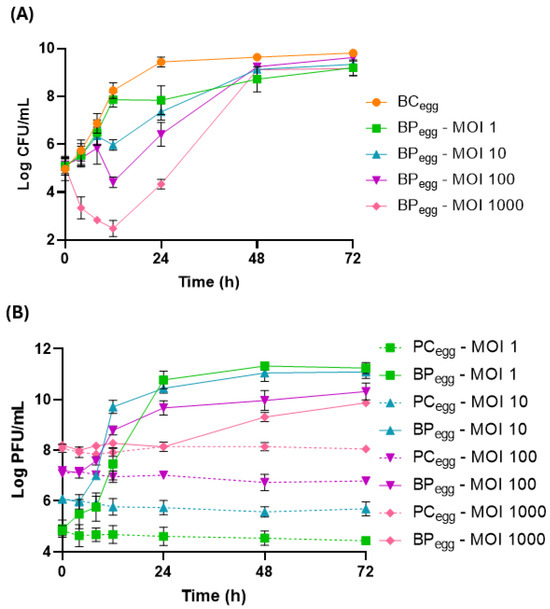 Phage titer remained constant in all phage controls (PCegg) (p > 0.05, Figure 5B). An increase in phage titer was observed in the sample (BPegg) relative to each corresponding PCegg (p < 0.05), with a higher increase for lower MOI values (6.8, 5.4, 3.5, and 1.8 log PFU/mL increase for MOI 1, 10, 100, and 1000, respectively).