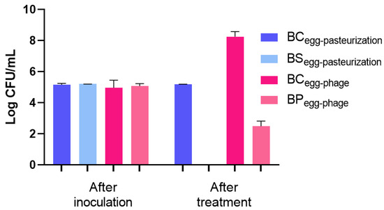 Inactivation of S. Enteritidis in liquid whole eggs by pasteurization (60 °C for 3.5 min) and by phage PCSE1 treatment (MOI 1000 after 12 h). BCegg-pasteurization—bacterial control for pasteurization with only bacterium, maintained at room temperature for 3.5 min (same duration as the heat treatment); BSegg-pasteurization—bacterial sample subjected to pasteurization (60 °C for 3.5 min); BCegg-phage—bacterial control for phage treatment with only bacterium, maintained at 25 °C for 12 h (same duration as the phage assay); BPegg-phage—bacterial sample treated with phage PCSE1 at MOI 1000 for 12 h at 25 °C. After inoculation refers to the time immediately following artificial contamination of the liquid egg in all conditions. Values represent the mean of three independent tests, with error bars representing the standard deviation. Values shown as 0 Log CFU/mL correspond to counts below the detection limit (1 CFU/mL).