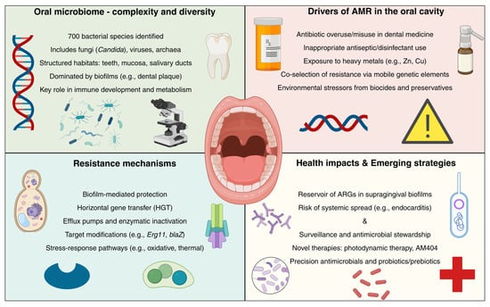 Importantly, the oral microbiome serves as a critical reservoir for antimicrobial resistance (AMR) genes, which can disseminate both locally and systemically. Frequent exposure to antibiotics through dental treatments, combined with the use of antiseptics and biocides in oral care products, creates selective pressure that facilitates the emergence and horizontal transfer of resistance determinants within oral biofilms [6,7,8,9]. This makes the oral cavity a hotspot for the exchange of resistance-conferring mobile genetic elements among diverse microbial species [10,11,12,13,14].