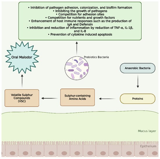 Role of probiotics in reducing oral malodor through sulfur compound pathway modulation. This Figure illustrates the role of probiotics in reducing oral malodor by inhibiting the activity of anaerobic bacteria responsible for the production of volatile sulfur compounds from sulfur-containing amino acids.