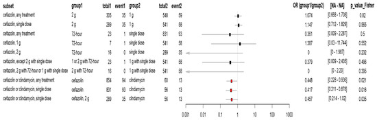 The forest plot illustrates the association between different antibiotic prophylaxis regimens and the incidence of surgical site infections (SSIs). Each row represents a comparison between the two treatment groups within a subset of the study population. The effect size is expressed as the odds ratio (OR), calculated as the odds of infection in group 1 divided by the odds in group 2. p-values were derived using Fisher’s exact test. Red squares indicate a significant effect.