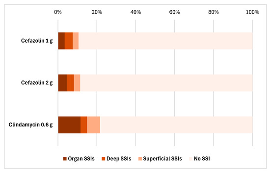 These results support the conclusion that cefazolin, especially when used at the appropriate dose, is a more effective and safer choice for surgical prophylaxis, while the use of clindamycin is associated with a significantly higher risk of SSIs.