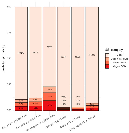 An ordinal logistic regression model with a cumulative link was employed to estimate the odds of more severe SSI as a function of the antibiotic–dosage category (cefazolin 1 g, cefazolin 2 g, clindamycin 0.6 g, 72 h) and the regimen category (single dose, 72 h) without their interaction. This model did not detect a significant difference between the regimens either: OR for 72 h vs. single dose: 0.25 (p-value: 0.1744). However, cefazolin turned out to be superior to clindamycin when the antibiotic–dosage categories were compared: OR of cefazolin 1 g versus cefazolin 2: 0.90 (p-value: 0.8800); OR of cefazolin 1 g versus clindamycin 0.6 g: 0.41 (p-value: 0.0231); and OR of cefazolin 2 g versus clindamycin 0.6 g: 0.45 (p-value: 0.0719). Based on this model, the proportions of different SSI severities could be predicted as shown in Figure 3.