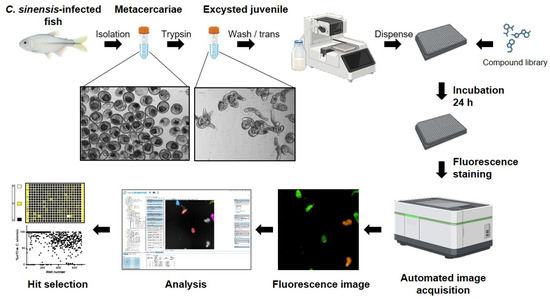 Schematic overview of in vitro screening and in vivo assay for the discovery of anti-C. sinensis compounds. Live metacercariae were isolated from infected freshwater fish. CsMC were excysted using trypsin, and most of the juveniles were released. CsNEJs were dispensed into the 384-well plate containing the test compounds. The parasites were stained with fluorescent dye 24 h after compound treatment and imaged immediately. Fluorescence images were acquired using an automated high-throughput screening system, and morphological features were extracted from multi-channel fluorescence microscopy images. Hit compounds were selected based on the percentage of live C. sinensis per well, calculated from the analyzed data. After confirmatory dose-response testing in vitro, an efficacy test was performed in a rodent model.