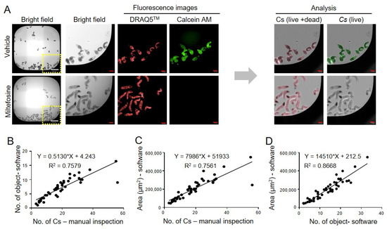 Analysis of live/dead ratio for anti-C. sinensis compound discovery assay. (A) Image acquisition and analysis of C. sinensis stained with calcein AM and DRAQ5. Calcein AM stains only live organisms with esterase activity, while DRAQ5 stains all the parasites. The white scale bar indicates 500 μm, and the red scale bar indicates 100 μm. The parasites in the yellow box on the left were enlarged and seen on the right bright field. (B,C) The quantification method was validated by comparing the DRAQ5-stained area (or the number of objects) obtained with software analysis and the number of C. sinensis counted by manual inspection. (D) The DRAQ5-stained area was increased in proportion to the number of C. sinensis.