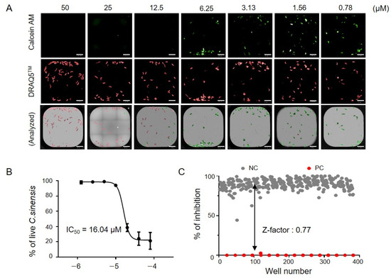 Quality control and negative control for the screening. (A) Representative im ages of C. sinensis after miltefosine treatment. Miltefosine showed an immediate anti-C. sinensis effect. Red indicates the DRAQ5-stained area and green indicates the calcein AM-stained region. The scale bar indicates 500 μm. (B) Dose-response curve of miltefosine. (C) The % inhibition of negative and positive wells is shown. The Z′ factor of the representative experiment was 0.77 in the screening system.
