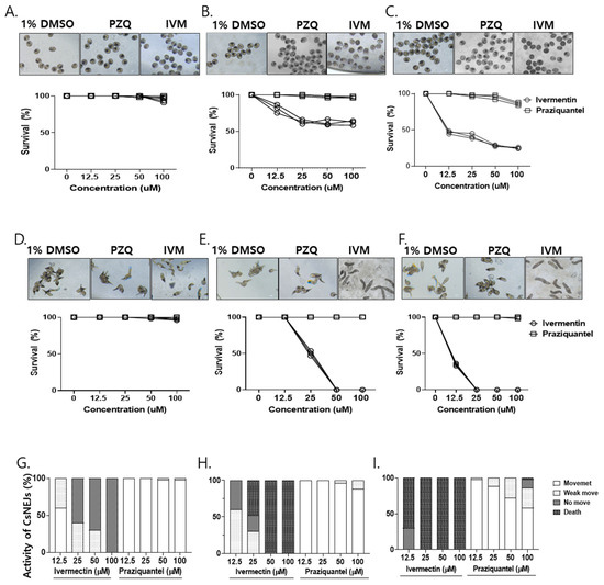 Assessing the larvicidal effect of ivermectin against CsMC and CsNEJs in vitro. Metacercariae and excysted larvae were treated with 12.5, 25, 50, and 100 µM concentrations of IVM or PZQ. Anti-metacercarial activity of the drugs was determined at 24, 48, and 72 h post-drug treatment for different doses of ivermectin (A–C). The larvicidal effects of ivermectin against CsNEJs were observed after 6, 12, and 24 h of drug exposure (D–F). To observe the effects of IVM and PZQ on the motility of CsNEJs, the juvenile worms were exposed to drug concentrations of 12.5, 25, 50, and 100 µM for 24 h and categorized into four stages: dead, viable but immobile, weak movement, and vigorous movement (G–I).