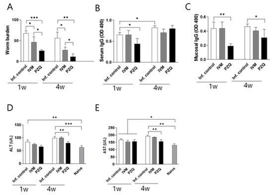 Ivermectin induced anti-C. sinensis efficacy in rats. CsMC-infected rats were treated at 1 and 4 wpi and subsequently euthanized 4 weeks after treatment for worm recovery from the bile ducts. The worm recovery rate in the untreated control group was 67.5%. In contrast, at 1 wpi, the worm reduction rate was 53.5% in the IVM-treated group and 68.5% in the PZQ-treated group. By 4 wpi, the reduction rates increased to 63.5% and 88.5% for IVM and PZQ, respectively (Figure 6A). Parasite-specific IgG responses were detected in all groups. At 5 wpi, serum IgG levels in the PZQ-treated group were significantly lower than those in the infection control group (* p < 0.05), while those in the IVM-treated group were comparable to controls (Figure 6B). At 8 wpi, serum IgG levels were comparable across all groups. In contrast, mucosal IgG levels were significantly lower in the PZQ treatment group at both treatment points (* p < 0.05, ** p < 0.01) (Figure 6C), where lower worm burdens were detected. In the IVM-treated group, mucosal IgG levels did not differ significantly from those of the infection control group at any time point. Furthermore, no significant differences were observed between the two treatment groups. These results suggest that mucosal IgG responses correlate more closely with worm burden than serum IgG levels, indicating greater sensitivity of the mucosal response. Liver function was evaluated by measuring serum levels of ALT and AST, which are enzymes released into circulation during hepatocellular damage and commonly used as indicators of hepatobiliary disease. Baseline ALT levels increased from 62.74 U/L to 80.19 U/L and 106.6 U/L at 5 and 8 wpi with C. sinensis, respectively (* p < 0.05, *** p < 0.001). At 1 wpi, ALT levels in the treatment groups did not significantly differ from those in the infection control. By 5 wpi, a significant reduction was only observed in the PZQ-treated group, but not in the IVM-treated rats (*** p < 0.001). A similar pattern was observed for AST. AST levels in the naïve group were 130.1 U/L, increasing to 167.4 U/L by 5 wpi and remaining elevated through 8 wpi with C. sinensis (** p < 0.01, *** p < 0.001). AST levels in the treatment groups at 5 wpi did not significantly differ from those in the infection control, whereas significant reductions were observed in the PZQ-treated rats at 8 wpi (*** p < 0.001) (Figure 6E). These results suggest that treatment with 30 mg/kg IVM and 250 mg/kg PZQ does not induce hepatotoxicity and may help preserve liver function during clonorchiasis.