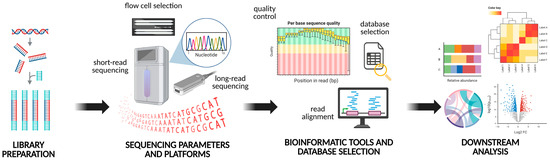 Overview of key decision points to consider in developing a workflow for metagenomics (created with https://www.biorender.com (accessed on 25 July 2025)).