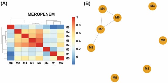 (A) A hierarchical clustering heatmap of antibiotic resistance genes (ARGs) detected in eight meropenem-exposed samples (M1–M8). The blue-to-red color scale represents the relative abundance or presence frequency of each ARG, revealing two distinct clusters: samples M2, M4, M6, and M7 share similar ARG profiles, whereas M1, M3, M5, and M8 display greater genetic variability. (B) An association network of the same samples further illustrates these relationships, with the closely connected cluster (M2, M4, M6, and M7) reflecting similar ARG compositions and the more isolated samples (M1, M3, M5, and M8) indicating higher ARG diversity in response to meropenem exposure.