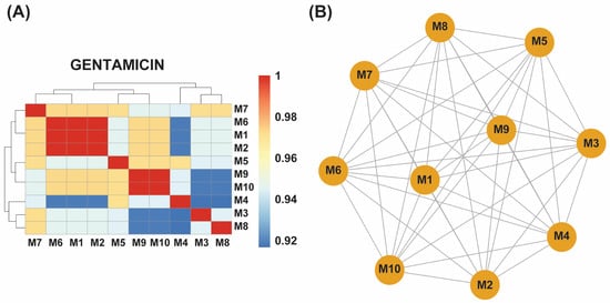 (A) A hierarchical clustering heatmap showing antibiotic resistance genes (ARGs) detected in ten gentamicin-exposed samples (M1–M10). The blue-to-red color scale indicates the relative abundance or presence frequency of each ARG. Samples M1, M2, and M6 form a distinct cluster with identical ARG profiles, while M9 and M10 exhibit another shared cluster. Other samples (M3, M4, M5, M7, and M8) correlate closely with these clusters, indicating a more uniform ARG distribution in response to gentamicin exposure. (B) An association network of the gentamicin-exposed samples further illustrates the relationships among their ARG profiles. M1, M2, and M6 are highly interconnected, reflecting identical ARG profiles, while M9 and M10 are similarly grouped. The remaining samples show a strong correlation with these clusters, confirming a more uniform resistance response across all ten samples.