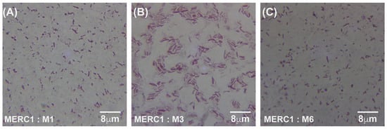 Gram-stained micrographs (100× magnification) of E. coli samples taken from the meropenem control lane (C1), which contained no antibiotic. Panels (A–C) correspond to samples M1, M3, and M6, respectively, all originating from the same antibiotic-free lane. MER = meropenem, C1 = lane without antibiotic, and M = sample number from that lane.
