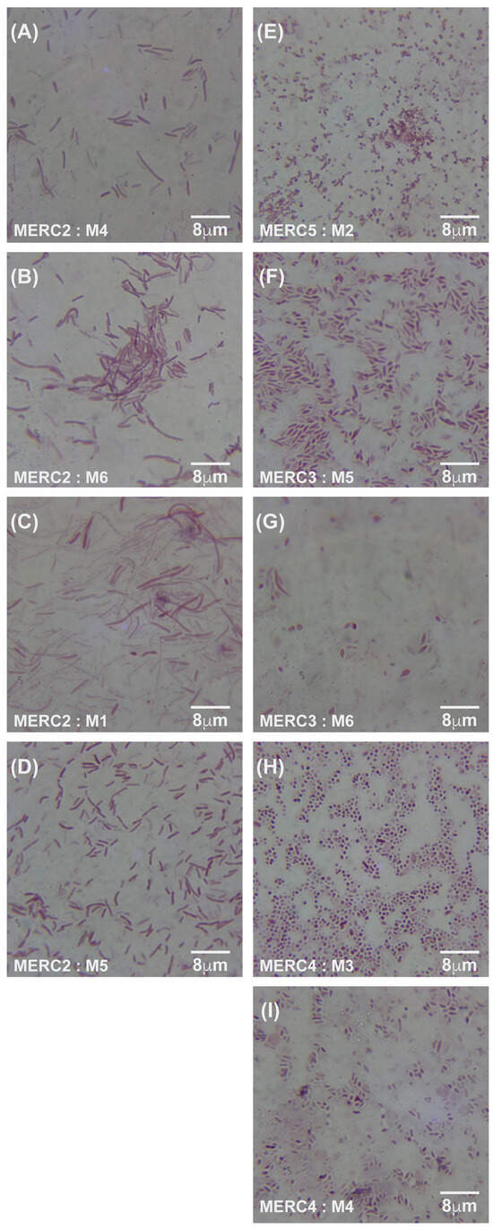 Gram-stained micrographs (100× magnification) of E. coli samples. (A–D) display samples from meropenem lane 2 (C2) at an MIC of 0.125 μg/mL, with corresponding micrographs of samples M4, M6, M1, and M5, respectively. (E–I) show samples from lanes 3, 4, and 5 (C3–C5), with micrographs of M2 from lane 5 at an MIC of 125 μg/mL, M5 and M6 from lane 3 at an MIC of 1.25 μg/mL, and M3 and M4 from lane 4 at an MIC of 12.5 μg/mL. MER = meropenem, C2–C5 = lane numbers, and M = sample number from the respective lane.