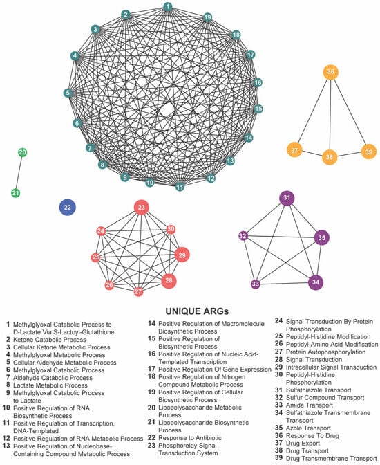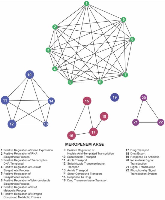 Network representation of biological functions associated with meropenem-related antibiotic resistance genes (ARGs). Each numbered node corresponds to a specific function (listed below), and the edges indicate relationships or co-occurrence between these functions. The clusters of nodes (indicated by distinct colors) represent groups of related processes—regulation of gene expression, biosynthetic activities, and antibiotic transport or response mechanisms—highlighting the complex functional landscape that emerges under meropenem pressure.