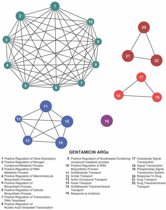Network representation of biological functions associated with gentamicin-related antibiotic resistance genes (ARGs). Each numbered node corresponds to a specific function (listed below), and the edges indicate relationships or co-occurrence among these functions. The clusters of nodes (color-coded) represent interconnected groups of biological processes—metabolic regulation, biosynthetic pathways, and antibiotic transport or response mechanisms—highlighting a tightly coordinated functional network under gentamicin exposure.