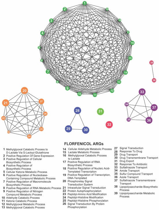 Network representation of biological functions associated with florfenicol-related antibiotic resistance genes (ARGs). Each numbered node corresponds to a specific function (listed below), and the edges indicate relationships or co-occurrence among these functions. The large, densely connected cluster represents a complex network of metabolic and biosynthetic processes, while the smaller groups highlight additional functions such as protein modifications, signal transduction pathways, and antibiotic transport or response. Together, these clusters illustrate the intricate functional landscape influenced by florfenicol exposure.