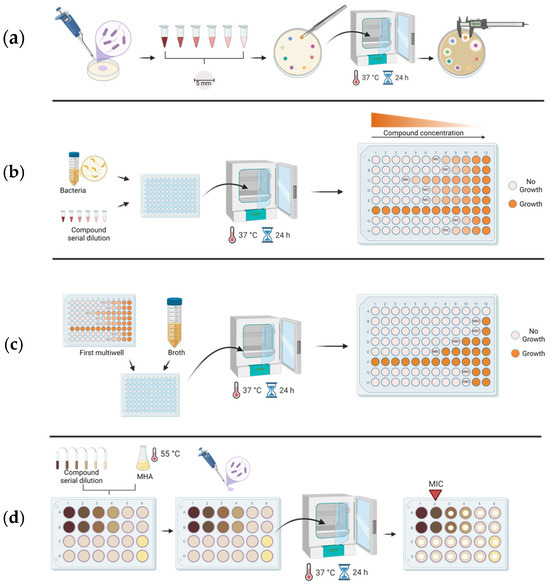 Schematic representation of the antimicrobial susceptibility testing methods employed in this study. (a) Disk diffusion assay (Kirby–Bauer method). Inhibition zones are measured to assess antimicrobial activity. (b) Broth microdilution for MIC detection, which is defined as the lowest concentration that does not significantly differ from that of the original inoculum by turbidimetry assay. (c) Broth microdilution for MBC detection, defined as the lowest concentration that does not significantly differ from that of the original inoculum after 24 h incubation at 37 °C by turbidimetry assay. (d) Agar dilution for MIC detection, defined as the lowest concentration showing no visible bacterial colonies. For details, see Section 4.