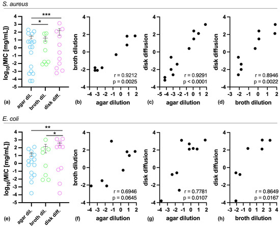MIC comparison and correlation between the antimicrobial testing methods. Data are reported as scatter plot of individual values and mean ± SEM on a log scale for S. aureus (a) and E. coli (e), with the statistical significance indicated as * p < 0.05, ** p < 0.01, and *** p < 0.001, as calculated by the Wilcoxon matched-pairs signed rank test. (b–d,f–h) MIC correlation between the antimicrobial testing methods. Spearman’s r coefficient and statistical p value are indicated in each graph as calculated by correlation analysis. Data are significant for p < 0.05.