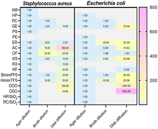 Similar behavior was observed when testing ionic liquids. 1-Butyl-3-methylimidazolium hexa-fluorophosphate (BmimPF6) showed an MIC value of 1380 mg/mL when tested by the disk diffusion method, while the value decreased to 69 mg/mL using agar or broth dilution methods. A decreased MIC value was also observed for 1-Decyl-3-methyl imidazolium bis (trifluoromethylsulfonyl)imide (HmimTFS) when comparing the results obtained by disk diffusion and dilution methods. The different MIC values obtained for the two ionic liquids featuring the same cation in the structure can be ascribed to the different length of the alkyl chain. Several studies reported that the length of the alkyl chain linked to the cation plays an important role in the ionic liquids’ antimicrobial activity [25,26,27,28]. The aforementioned discrepancies underscore the limitation of diffusion-based assays due to a steric hindrance in the solid agar structure, so that it results in a diffusion block for the tested substances, as recently reported in the literature [25,44] and also experienced in our previous studies [45]. Limitations of this method were also reported in the literature when using it for detecting the activity of poorly soluble molecules [46,47]. This does not mean that the substances have no antimicrobial activity, but it underlines the difficulty of leaching and acting against the bacteria. Molecular weight, solubility, and diffusion rate could, in fact, impact the diffusion of test substances in the agar [44].