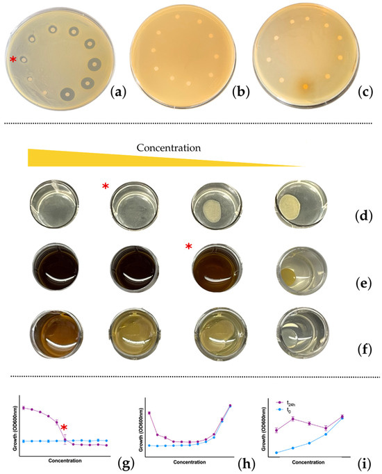 Representative images of antimicrobial susceptibility testing outcomes. (a–c) Disk diffusion method showing when (a) MIC is identified or not (b,c), with some diffusion of extract components in the agar. (c–f) Agar dilution method when (d,e) MIC is determined; the presence or absence of bacterial growth could be clearly determined (e) even with darkly colored substances. (f) Growth is evident at all concentrations tested; hence, MIC determination is not possible. (g–i) Broth dilution method. (g) MIC was correctly identified. This was not the case in (h), and (i) where the substance under investigation interfered with spectrophotometric readings, preventing accurate detection of the bacterial signal at higher concentrations. MIC values are indicated by a red asterisk. (a) rifaximin on S. aureus, (b) Arnica montana extract on E. coli, (c) Harpagophytum procumbens on E. coli, (d) erythromycin on S. aureus, (e) Harpagophytum procumbens on S. aureus, (f) Arnica montana extract on E. coli, (g) amoxicillin/clavulanic acid on E. coli, (h) rifaximin on E. coli, (i) Arnica montana extract on E. coli.