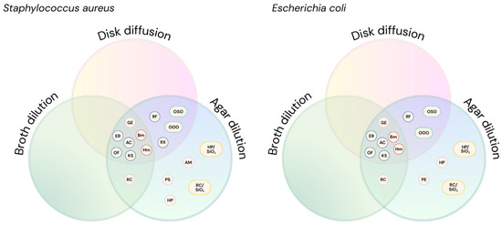 Graphical distribution by Venn diagram of the results obtained using the three methodologies: disk diffusion, agar dilution, and broth dilution. Compounds are color-coded as follows: synthetic antibiotics (blue), oils (green), ionic liquids (orange), silica-based formulations (yellow), and phytochemicals (pink). AM (Arnica montana extract), HP (Harpagophytum procumbens extract), RC (Rosa canina extract), GE (grapefruit extract), PS (polyphenol Solgar), PE (polyphenol Emma), ER (erythromycin), AC (amoxicillin/clavulanic acid), OF (ofloxacin), KS (kanamycin sulfate), RX (rifaximin), RF (rifampicin), Bm (BmimPF6), Hm (HmimTFS), OOO (ozonated olive oil), OSO (ozonated sunflower oil), HP/SiO2 (Harpagophytum procumbens/SiO2), RC/SiO2 (Rosa canina/SiO2).