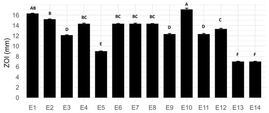Zone of inhibition (ZOI) of E. coli L1PEag1 exposed to different LAB-derived ExAF formulations (E1–E14). Data represent mean (mm) ± standard deviation. Different letters above bars indicate statistically significant differences between treatments (p < 0.05, Tukey test).
