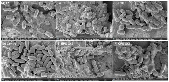SEM micrographs of MDR E. coli L1PEag1 after treatment with different ExAFs. (A) E1 (CFS Gt28L: Gt2, 3:1, v/v); (B) E2 (CFS Gt28L + EPS Gt2, 3:1, v/v); (C) E10 (CFS Gt21O); (D) untreated control; (E) EPS Gt2 alone; (F) CFS Gt2 alone. Cells exposed to ExAFs (A–C) show surface irregularities and aggregation, while the control (D) retains normal rod-shaped morphology. EPS Gt2 (E) caused membrane damage and deformation, whereas CFS Gt2 (F) induced pronounced cell disruption and lysis, evidencing the antimicrobial effects of L. plantarum-derived metabolites. Magnification: 20,000×; scale bars: 2 µm.