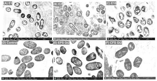The antimicrobial effects of ExAFs were further elucidated through SEM and TEM analysis, which revealed pronounced morphological and ultrastructural damage in treated bacterial cells compared to the untreated control (Figure 3 and Figure 4). SEM micrographs revealed distinct morphological differences between treated (Figure 3A–C,E,F) and untreated (Figure 3D) bacterial cells. In the untreated control group (Figure 3D), cells retain a typical rod-shaped morphology with smooth surfaces and intact membranes, indicative of healthy, undisturbed cells. In contrast, treatments with formulations E1, E2, and E10 (Figure 3A–C) resulted in marked structural alterations. Cells appeared deformed, exhibiting surface wrinkling, collapse, and irregular contours. Among these, E10 (Figure 3C) induced the most pronounced damage, with severe membrane disruption and cellular aggregation, supporting a potent bactericidal effect likely mediated by membrane-active metabolites such as phenolic acids and hydrophobic peptides. Treatment with EPS Gt2 (Figure 3E) caused moderate morphological alterations, including surface roughening and partial deformation, with cells embedded in an amorphous matrix. These observations suggest interactions between exopolysaccharides and the bacterial envelope, indicative of anti-biofilm activity or physical entrapment that contributes to antimicrobial efficacy. Likewise, the most drastic alterations were observed following exposure to the CFS Gt2 (Figure 3F), where extensive lysis, clustering, and membrane collapse point to the activity of secreted antimicrobial metabolites that likely disrupt membrane integrity and permeability. However, these results indicate that tropical-fruit-derived L. plantarum strains produce bioactive compounds with the capacity to compromise bacterial cell structures, supporting their potential as natural antimicrobial agents.